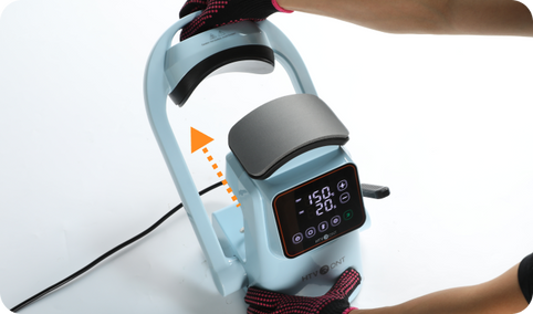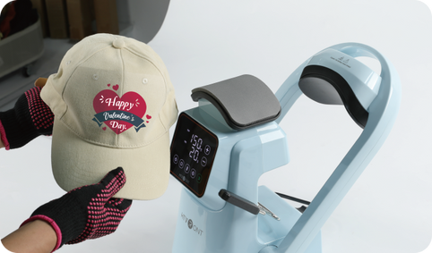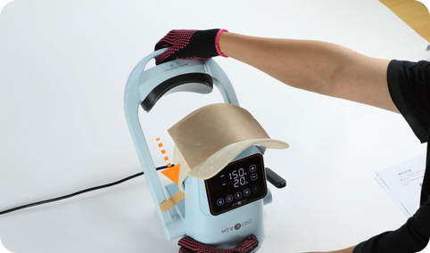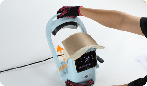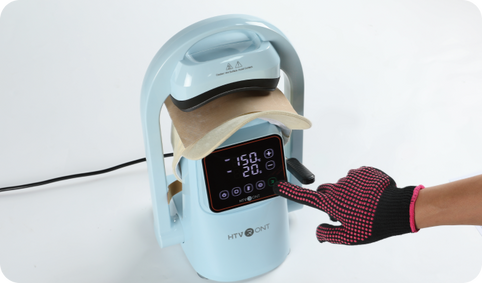 Une fois la température réglée atteinte, placez directement la plaque chauffante sur le motif pour le recouvrir. Appuyez sur le bouton « R » — la plaque pour casquette se soulèvera automatiquement. Une fois terminé, la plaque redescend et l’appareil émet trois bips.